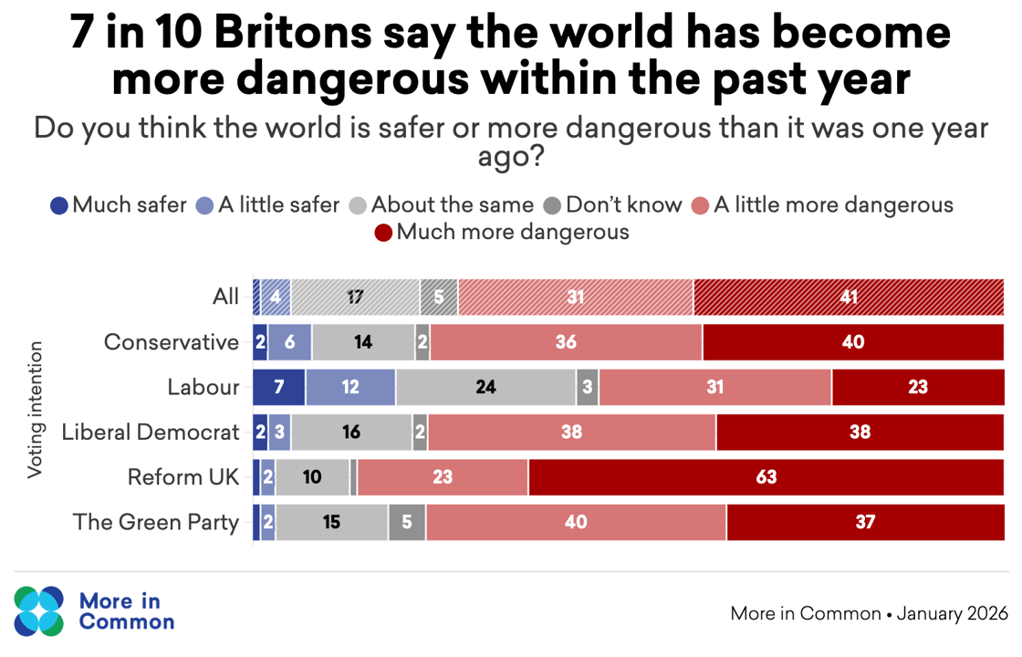 We found that very few Brits think the world is becoming a safer place to live: just 5 per cent say the world has become safer in the previous year, while more than 7 in 10 (72 per cent) per cent say the world is becoming more dangerous.