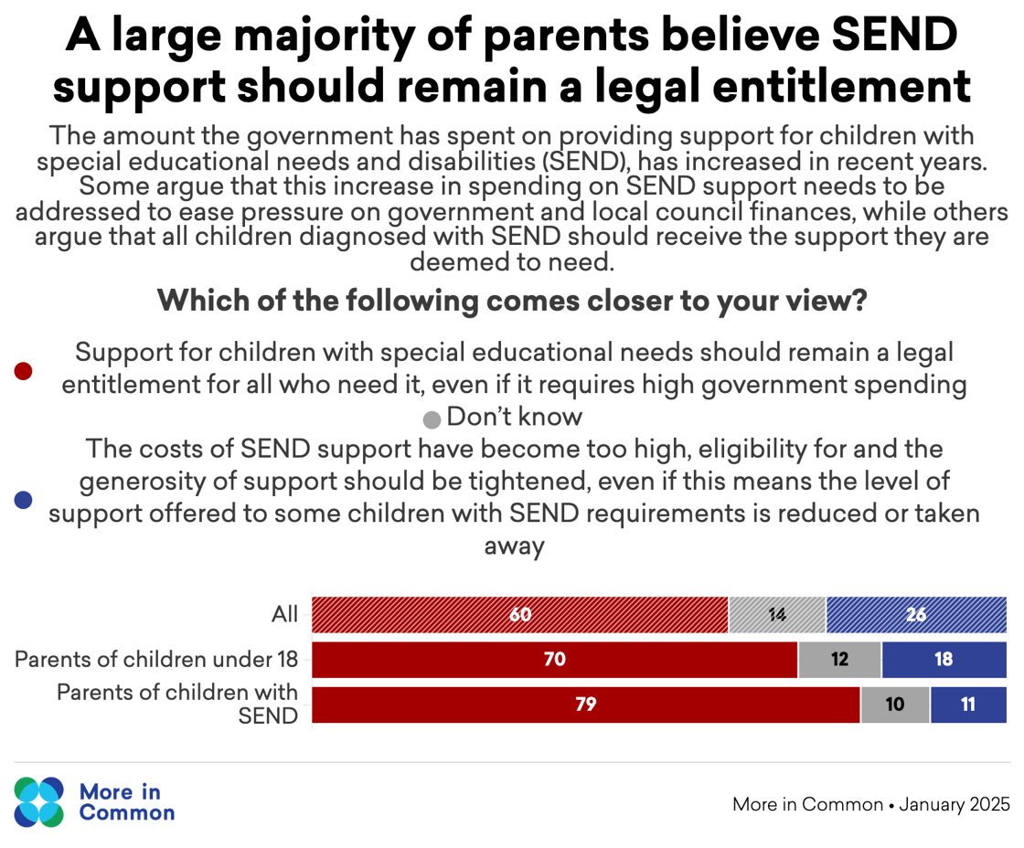 Our latest research finds Britons strongly support the legal entitlement to provision of SEND support: 60 per cent believe support should remain a legal entitlement for all who need it, even if this requires significant government spending. Only 26 per cent think eligibility should be tightened.