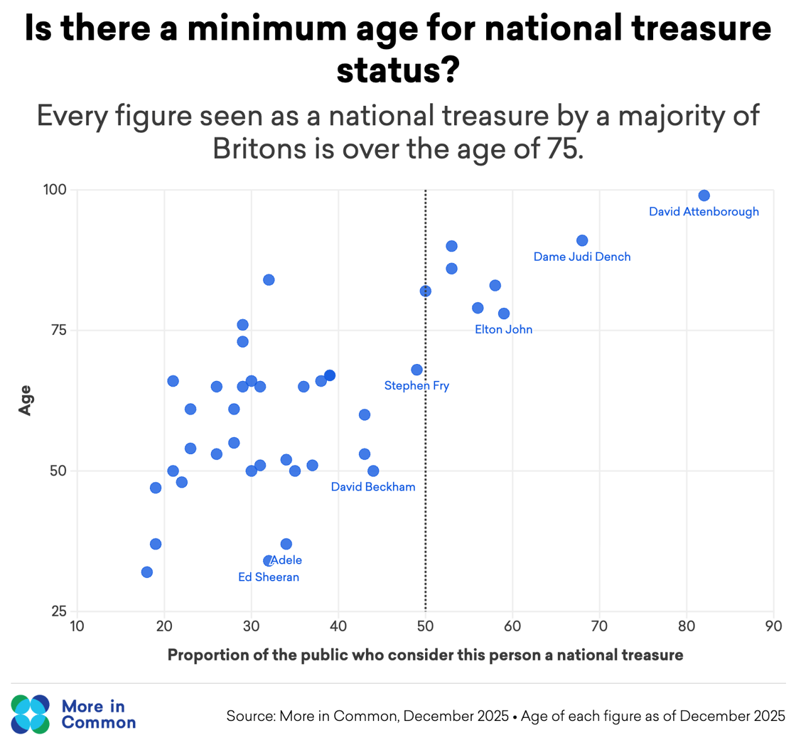 There are a few notable younger standouts. Despite only being in their thirties, more than a third of the public consider Ed Sheeran and Adele to be national treasures.
