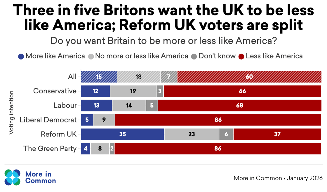 In addition, most people (60 per cent) in the UK would rather Britain was less like the US; just 15 per cent want to be more like the States. However, Reform UK voters are the exception, with views more evenly split: 35 per cent want Britain to be more like America, while a similar share (37 per cent) want the UK to be less like America and 23 per cent say they don’t want things to change either way.