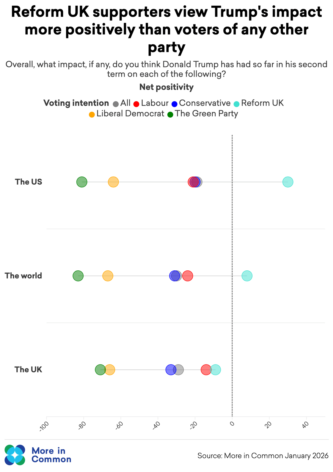 However, current Reform voters stand out in their view that the President's impact has been positive: they are more likely to say that Trump has had a positive than a negative impact on the USA and the world - although like other voter groups, they tend to think Trump has negatively affected the UK.