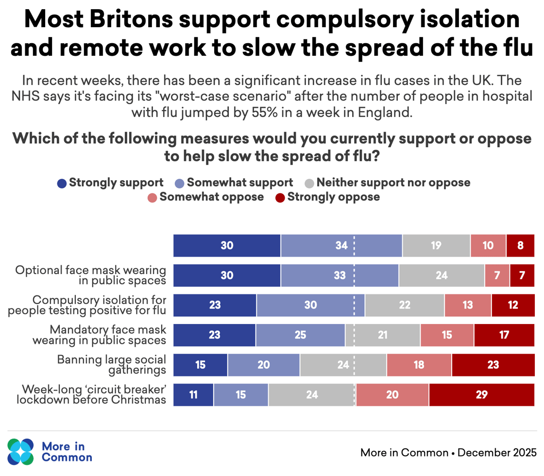 We find that the public are often more authoritarian - particularly on health - than you might expect. Public opinion on flu control measures are no exception.More than three in five Britons (63 per cent) would support compulsory working from home for people in jobs that can do it; More than half (52 per cent) would support compulsory isolation for those who test positive for the flu.